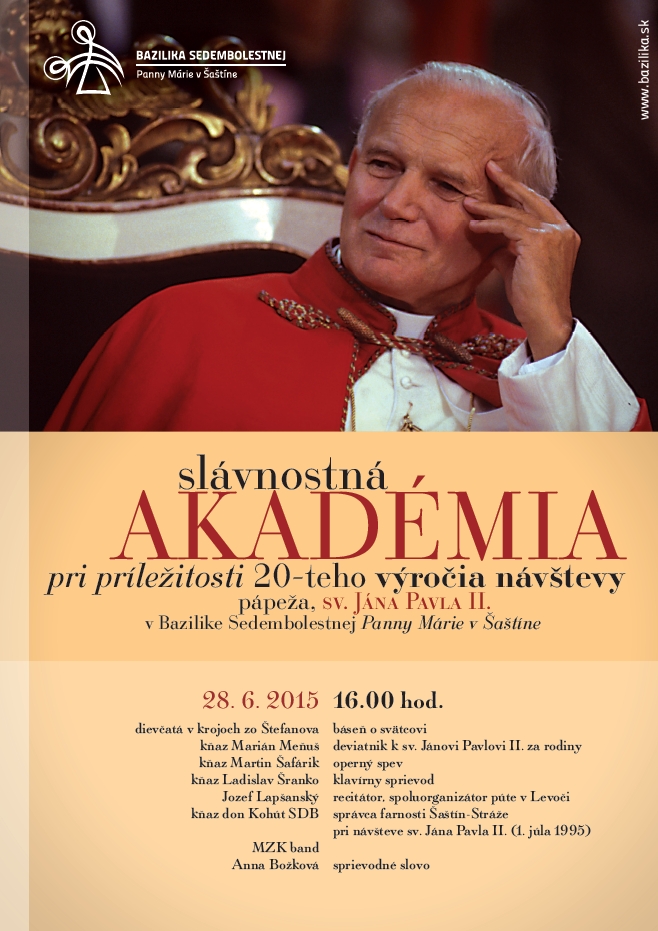 V Národnej Svätyni, v Bazilike Sedembolestnej Panny Márie v Šaštíne-Strážach, sa uskutoční Slávnostná akadémia pri príležitosti 20. výročia návštevy pápeža, sv. Jána Pavla II. v Šaštíne-Strážach. Účinkujú kňazi: Martin Šafárik - operný spev, Ladislav Šranko - klavírny sprievod, Marián Meňuš, iniciátor deviatnika k sv. Jánovi Pavlovi II. za rodiny, Don František Kohút - kňaz v Bazilike pri návšteve v r. 1995, MZK band. Zaznejú tiež svedectvá kňazov o tom, ako ovplyvnil ich život sv. Ján Pavol II. Na podujatí bude i jeho relikvia. Recitátor: Jozef Lapšanský, tiež organizátor osláv pri príležitosti návštevy sv. Otca na Mariánskej hore v Levoči.
