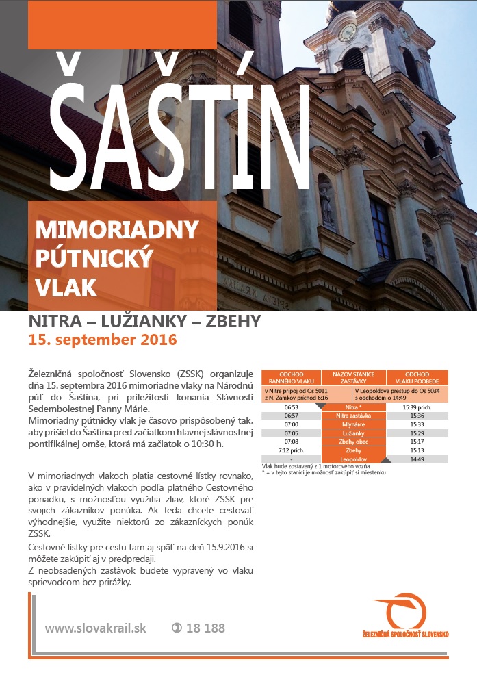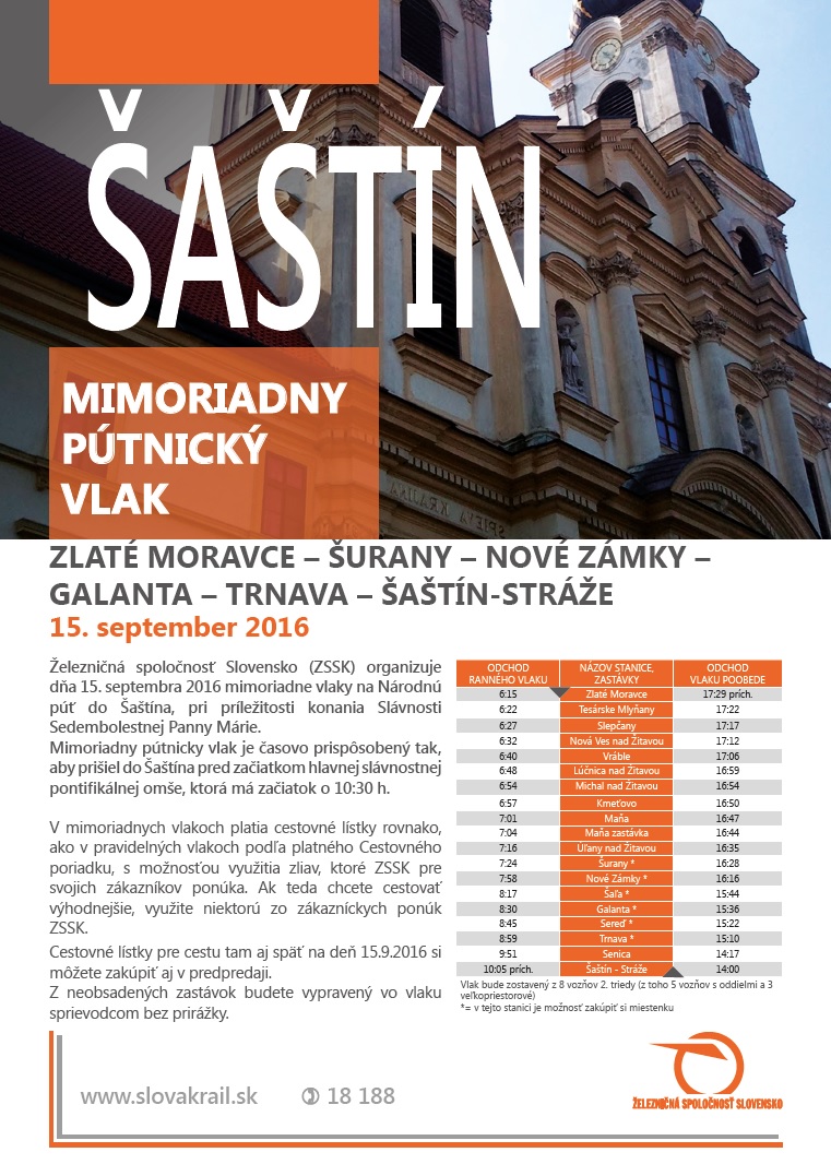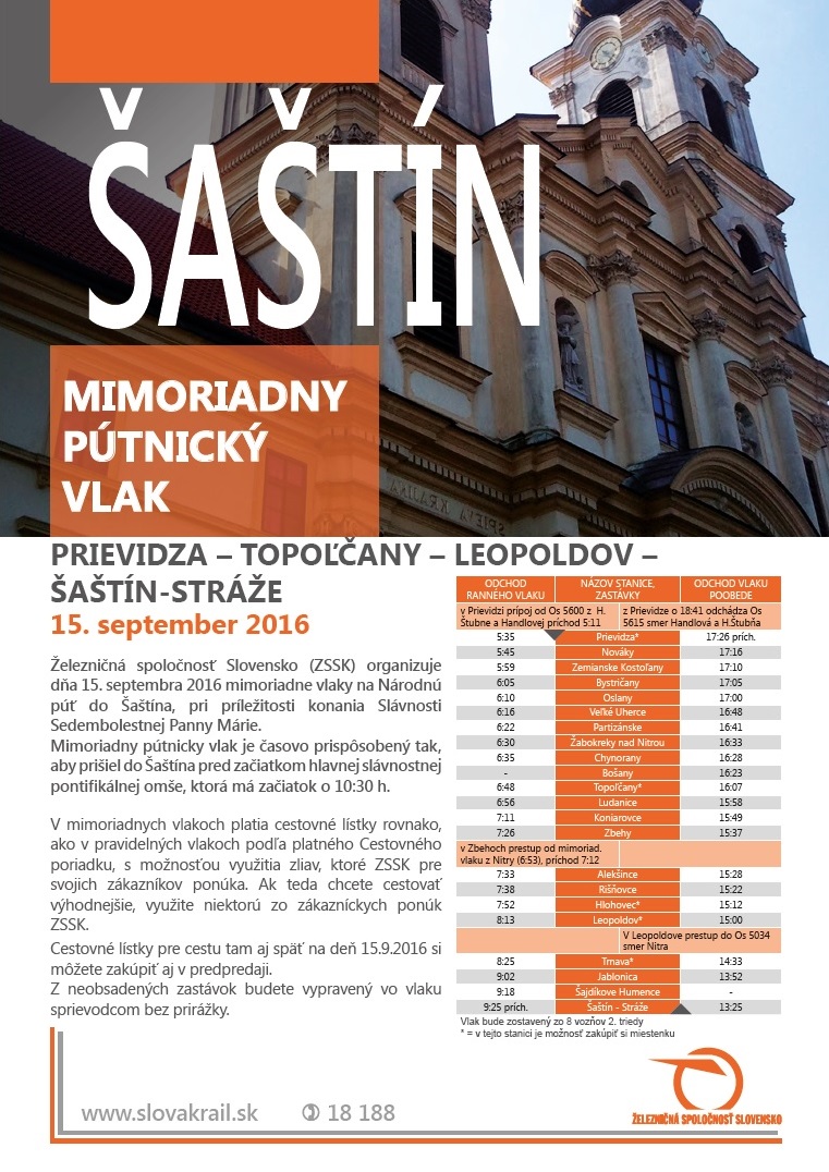Trasy a časový harmonogram týchto vlakov sú uvedené v nasledujúcich plagátoch. Pútnické vlaky sú časovo prispôsobené tak, aby boli pútnici v Šaštíne pred začiatkom slávnostnej omše so začiatkom o 10:30 h.